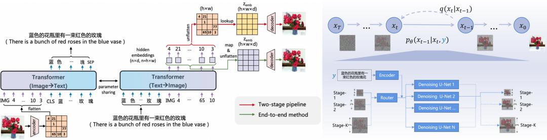 左为双向图像 - 文本生成的 ERNIE-ViLG 模型架构,右为渐进式扩散模型算法。