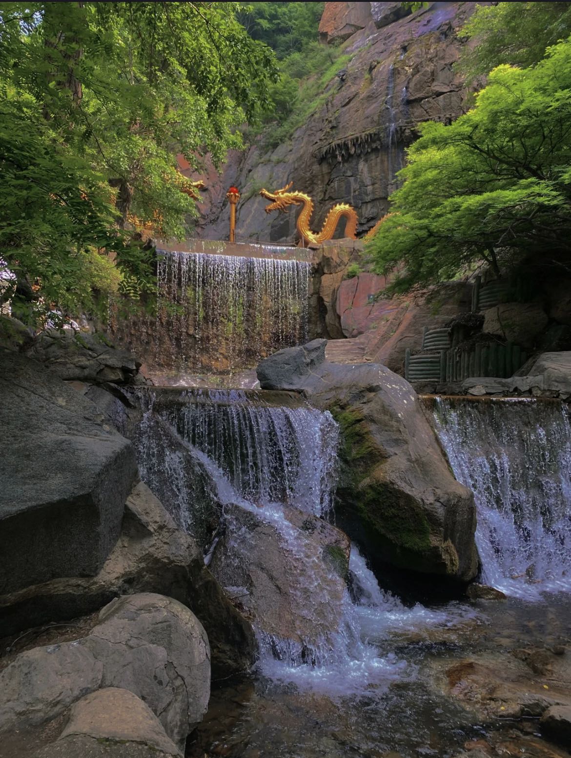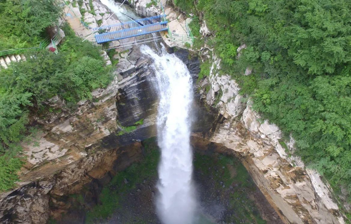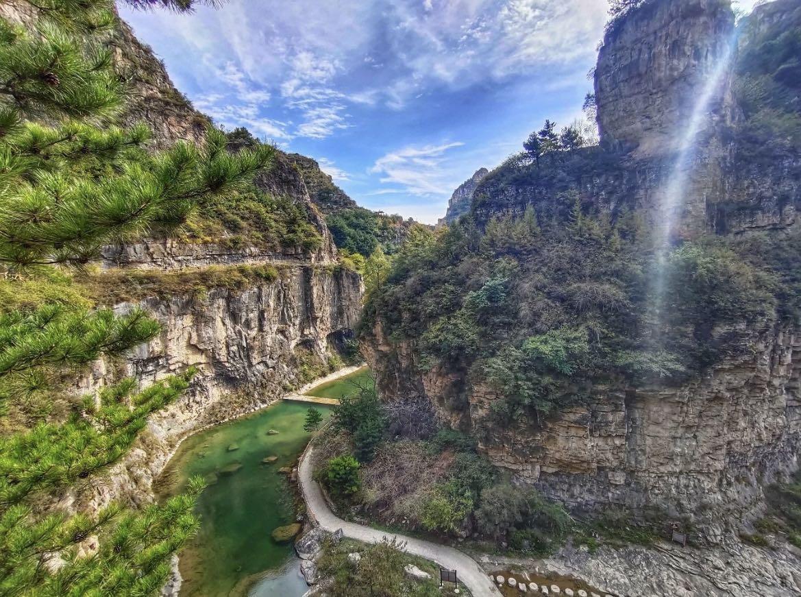 形态各异奇峰异石贯穿整个景区:惟妙惟肖、栩栩如生天然佛祖像,赋有民间神话传说神牛谷、飞来峰、求贤峰、龙爪峰、骆驼峰……也各有各传说,各有各奇特。 扶梯而上绝壁栈道,依崖而凿,俯视山谷,落差300余米,惊险刺激之余,山间美景尽收眼底。用时两年全人工开凿完成灵音洞长48米,宽2.7米,再现了当地人民“愚公移山”之壮举. “风经绝顶回疏雨,石倚危屏挂落泉”,天脊山瀑遍布山谷,水流清澈透明,流水声清脆悦耳。.其中天脊龙瀑,落差达346米,,气势宏伟,堪称“华夏第一高瀑”。站在瀑底仰望高瀑,瀑水从天而降,似颗颗珍珠被风吹过飘飘缈缈而落,此景之美无不令人叹为观止。“南有黄果树,北有天脊瀑”真可谓名不虚传。如果把黄果树瀑布比做一阳刚美男,天脊瀑则是一风情万种,尽显妩媚之态少女。