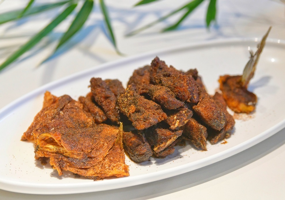 煠紫盖。从前做焖肉的商家都有“煠紫盖”,尤其是夏季。其实就是焖肉的边角料,挂糊后油炸。汪大师做改进,不用边角料,只用完整的、五花焖肉做底料,油煠偏老,外皮松脆,改刀后装盆,一扫从前边角料的扮相,有了尊严,步入经典名菜之列。