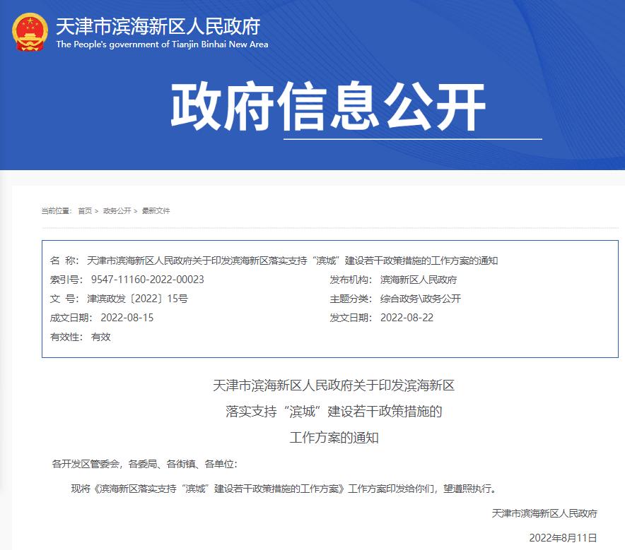 近日,天津市滨海新区人民政府印发《关于落实支持“滨城”建设若干政策措施的工作方案》(以下简称《方案》)。