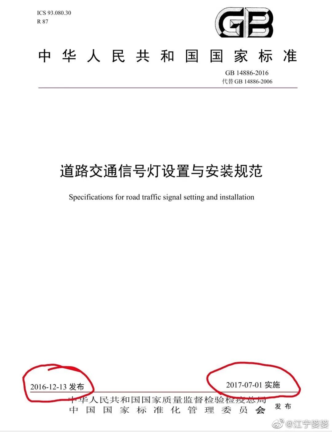 查询发现,所谓“新国标”并非近期发布,而是2016年12月13日发布、2017年7月1日起实施的GB 14886-2016《道路交通信号灯设置与安装规范》(以下简称“国标2016”)。“国标2016”自2017年起生效,已有五年。