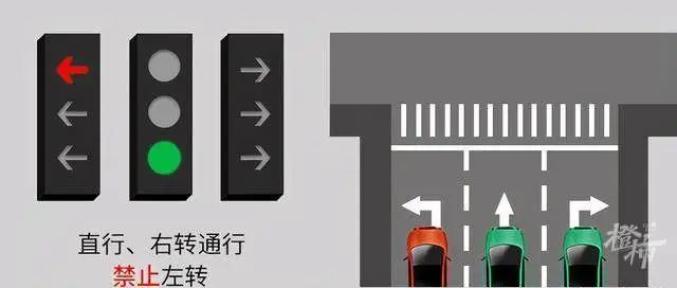 左边没有亮灯,中间亮绿灯,右边亮红灯,就表示可以左转和直行,但是不能右转。