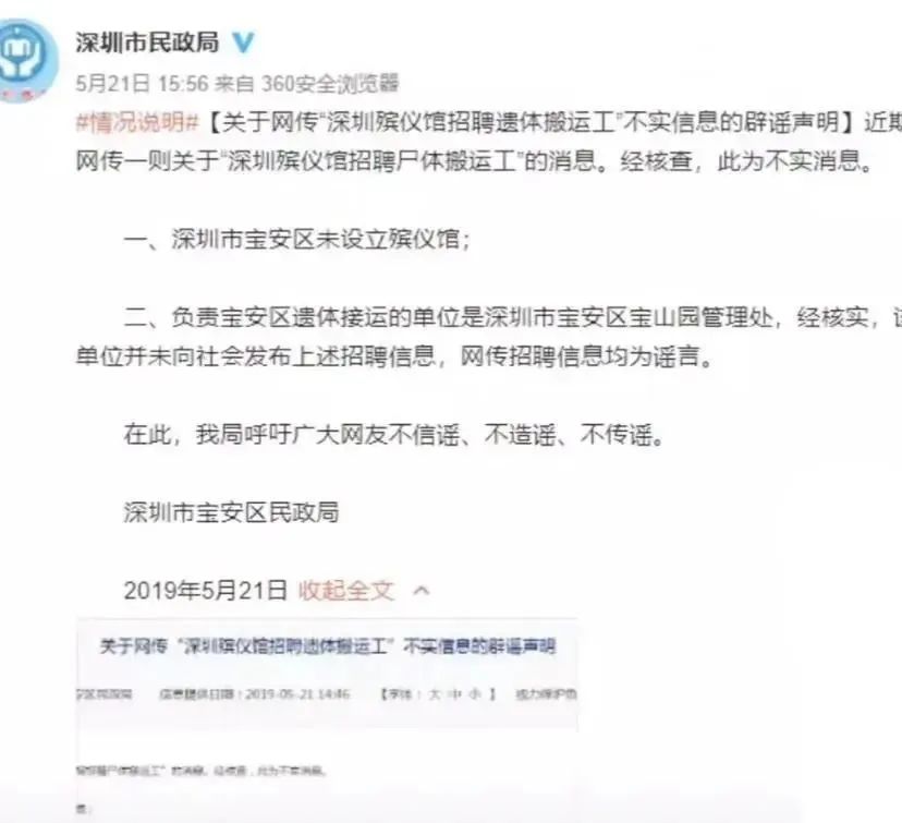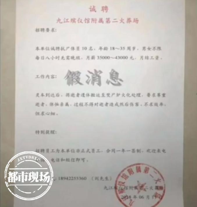 江西九江一殡仪馆年薪40万招“扛尸员”,也被网友热传。九江市殡葬管理处的工作人员告诉记者,“这招聘信息假的太离谱了“。