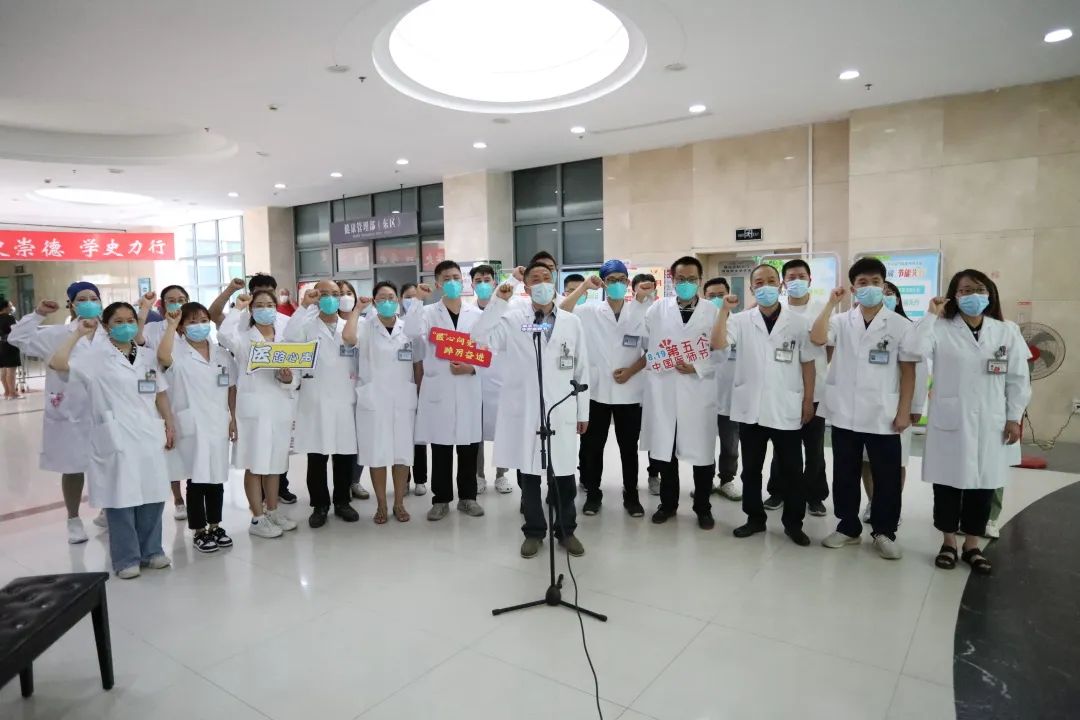 浦东新区人民医院为医生们送上蛋糕和定制礼物。8月18日中午,医院开展了“医”型“医”秀快闪活动,通过诗歌朗诵《大医精诚》、钢琴弹奏《追光者》以及歌曲《萱草花》的演唱,引来了来往医务人员和患者、家属的驻足,而由陈篁作词、陈弘作曲并演唱的弘扬医者大爱的原创歌曲《信念》也首次在医师节发布,这首歌表达了对医者崇敬,唱出了希望和期待!现场医师一起重温希波克拉底誓词。