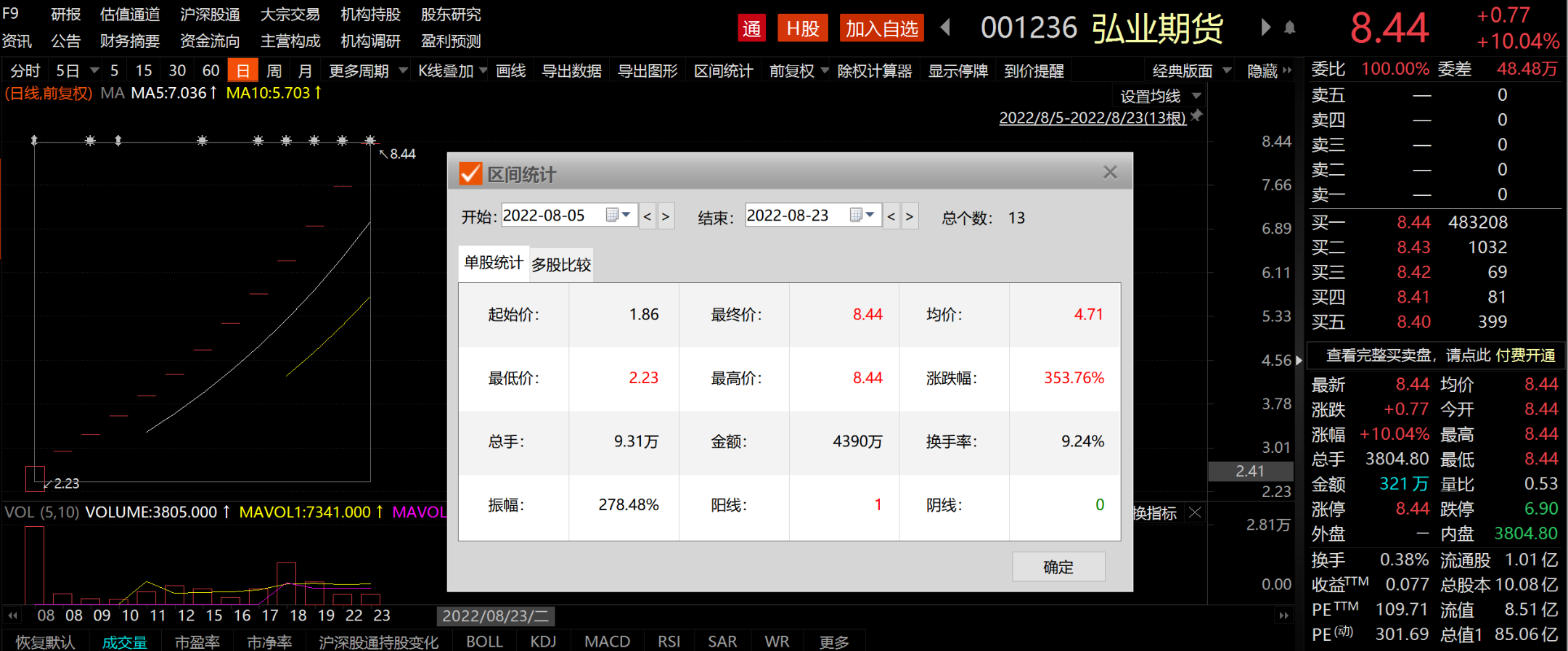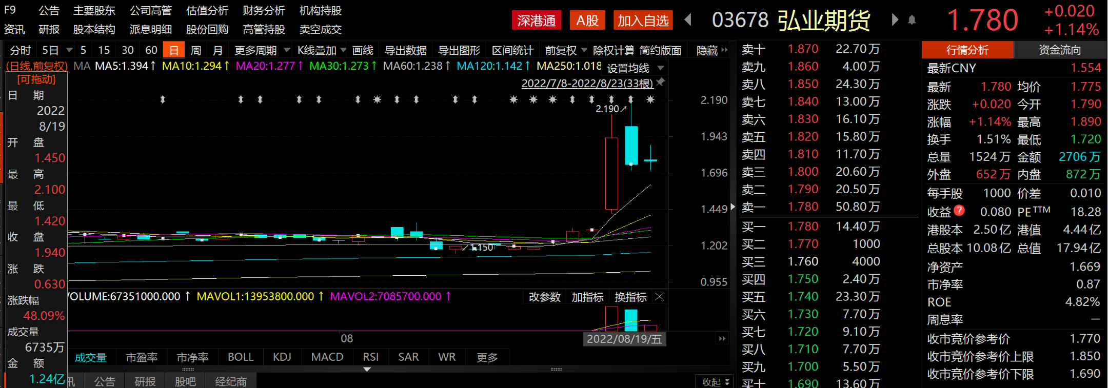 作为国内首家“A+H”期货公司,弘业期货自8月5日在A股上市以来,股价已累计上涨353.76%。