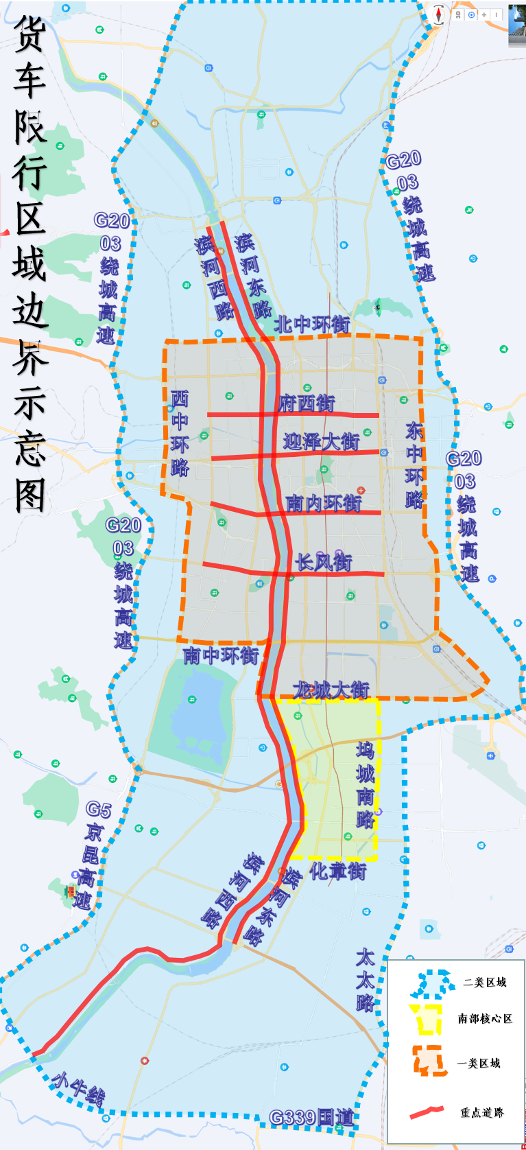 G339国道(太太路至南格村段)、小牛线(南格村至G5京昆高速段)以北,G5京昆高速、G2003绕城高速西段以东,G2003绕城高速北段以南,G2003绕城高速东段、唐槐路、太太路以西(不含上述边界道路;绕城高速公路过境货运车辆分流管控措施不变)所围区域,以及滨河东路(中北大学至G2003绕城高速西北环段)、滨河西路(小牛线至清东路段)、柴西公路(新兰路至G2003绕城高速西北环段)、阳兴大道、太榆路(秋郭线以北段)、晋祠路、迎宾路、晋白线(小牛线以北段)、西矿街、西铭路(西山外环路以南段)和南沙河、北沙河、北涧河、玉门河、虎峪河、风峪河、冶峪河、九院沙河、北排洪渠沿岸道路。上述区域不含一类区域、南部核心区域及重点道路。