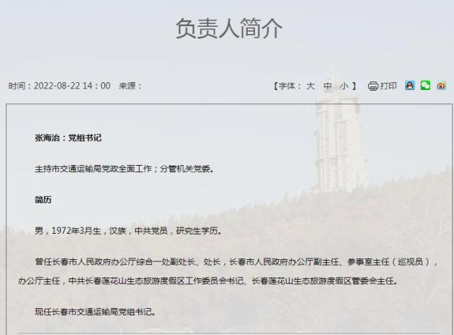 8月22日,长春市交通运输局官网“负责人专栏”显示,张海治已出任长春市交通运输局党组书记,主持市交通运输局党政全面工作;分管机关党委。