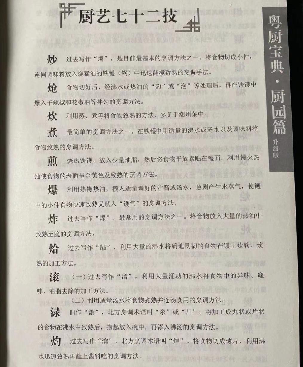 这一个决定粤菜灵魂的关键字,就是它的烹调方法。粤菜文化博大精深,光是烹调方法不下十几二十种。翻看潘英俊的《粤厨宝典》,好家伙,整整72种!