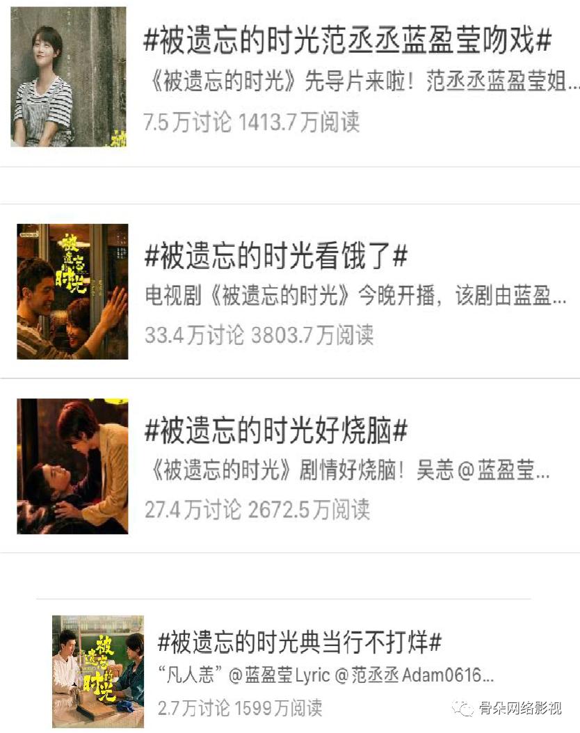 该剧正式上线前便因片花中的吻戏登上热搜,男主范丞丞的荧屏初吻和看起来带感的爱情线吸引了不少观众提前入股,想要嗑一波CP的糖。但在剧集开播后,观众的关注点被层层反转的情节和甜虐交织的爱情线共同收割,剧集的相关讨论则围绕着#被遗忘的时光看饿了# #被遗忘的时光好烧脑# #被遗忘的时光范丞丞蓝盈莹吻戏# #吴恙路小凡好甜# 等多方面话题,获得了较高的社交平台讨论度。