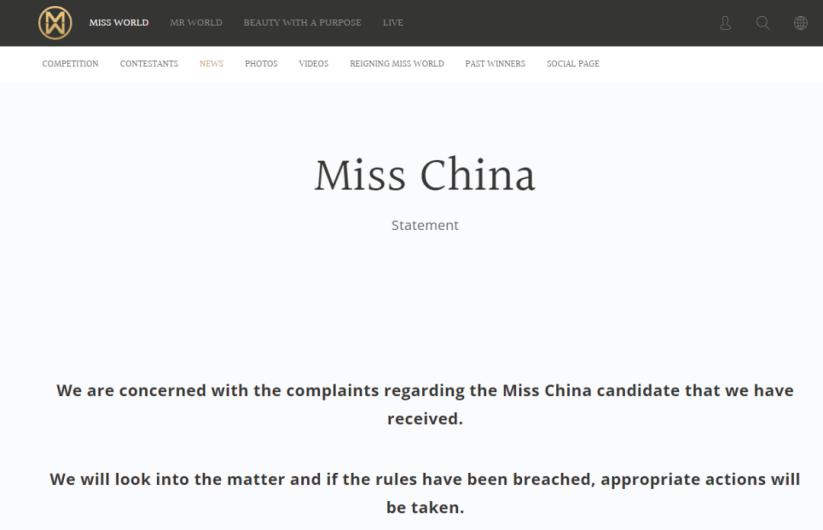 而在北京时间8月24日晚间,世界小姐官网曾发布声明称,“我们对收到的有关代表中国参加本届世界小姐全球总决赛的候选人的投诉表示关注。我们将调查此事,如果违反规定,我们将采取适当行动。”
