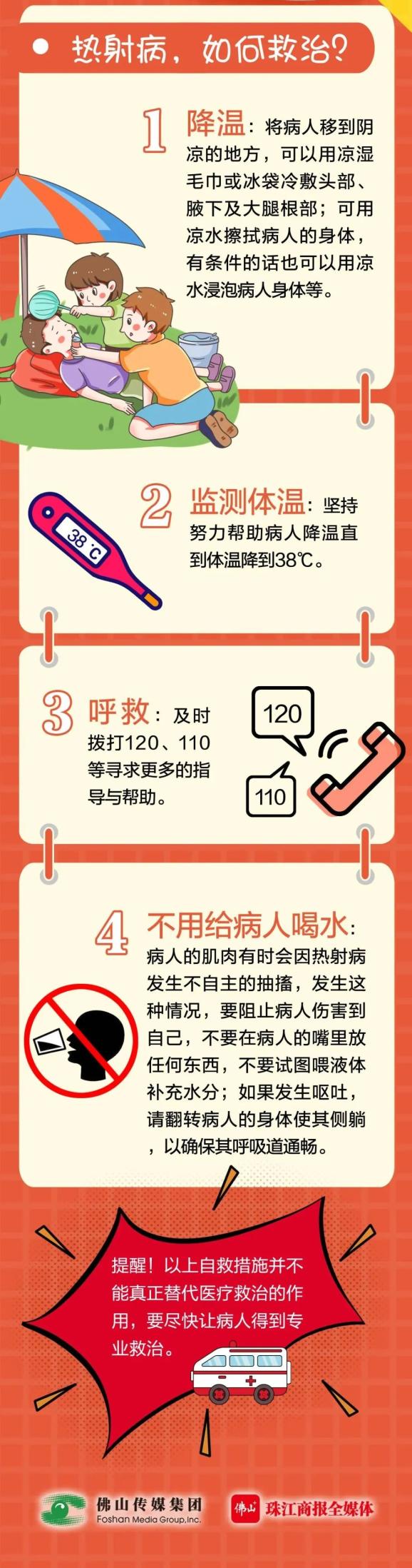 另外,如遇到中暑或疑似热射病的情况,应尽快将病人安置到阴凉地方,尽快给予降温,在病人清醒状态下尽快给予补充水分,假如病人已进入昏迷状态时应第一时间将其送院救治。