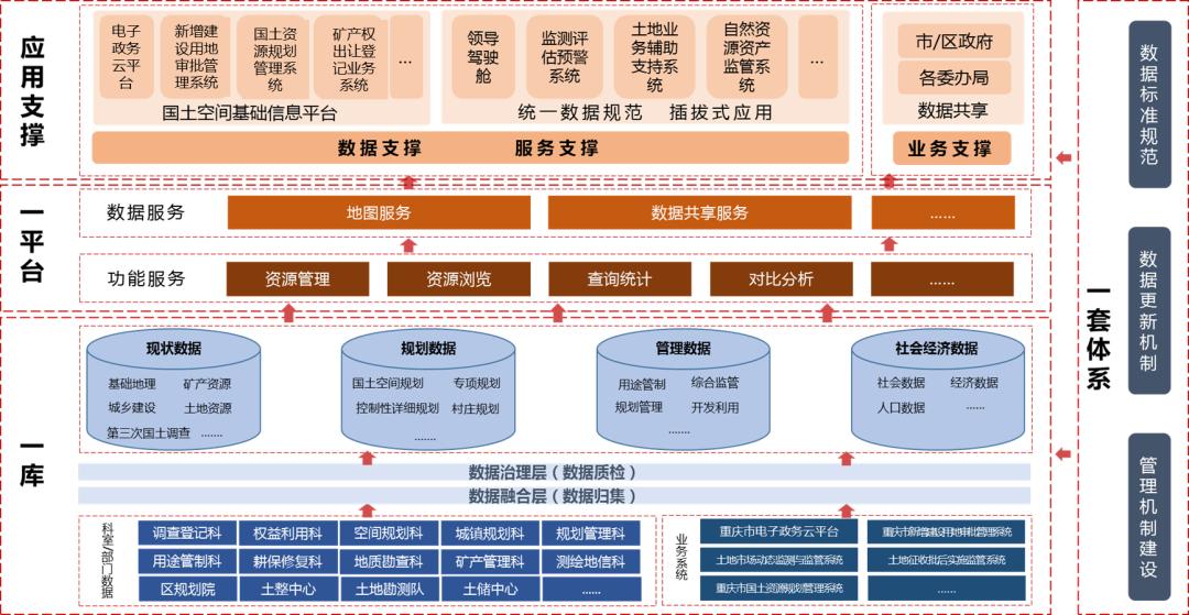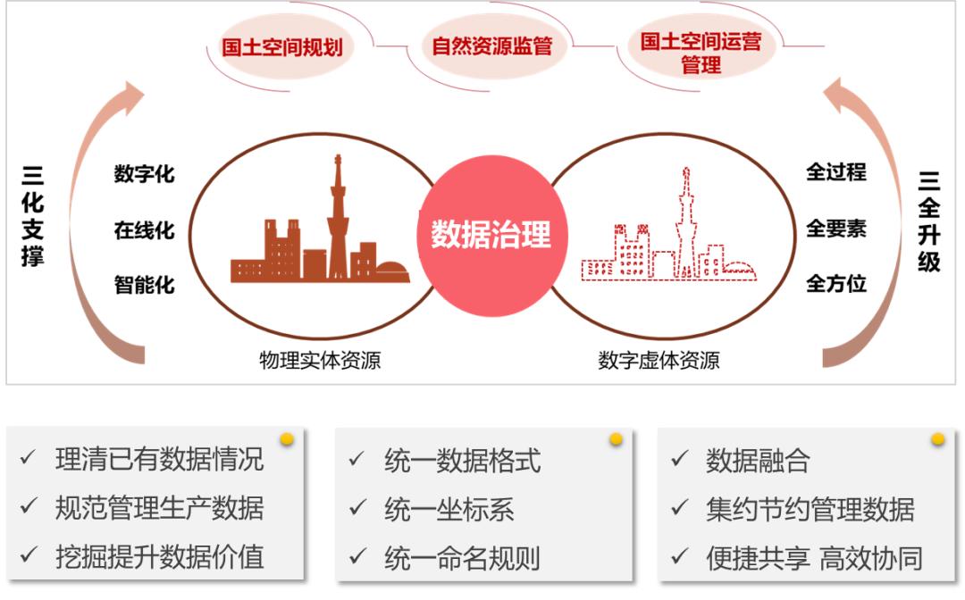 以规划编制、审查、实施监督全流程数据支撑为目标,建设国土空间规划统一数据底座,基于“统一标准、统一管理、统一平台、统一应用”原则,提供“汇数据、管数据、用数据”的全流程工具,实现国土空间全域、全要素的数字化、网络化、智能化。