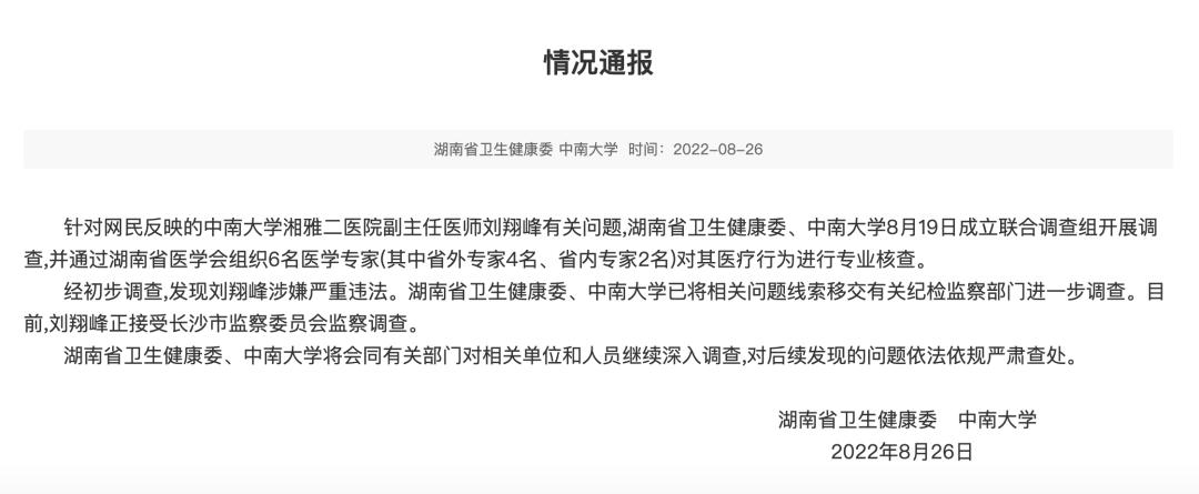 据湖南卫健委网站8月26日消息,湖南省卫生健康委员会、中南大学通报,针对网民反映的中南大学湘雅二医院副主任医师刘翔峰有关问题,湖南省卫生健康委、中南大学8月19日成立联合调查组开展调查,并通过湖南省医学会组织6名医学专家(其中省外专家4名、省内专家2名)对其医疗行为进行专业核查。