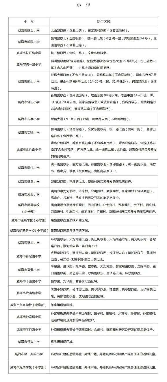 1. 小学招生对象:环翠区户籍及外来务工人员随迁子女年满6周岁的适龄儿童。