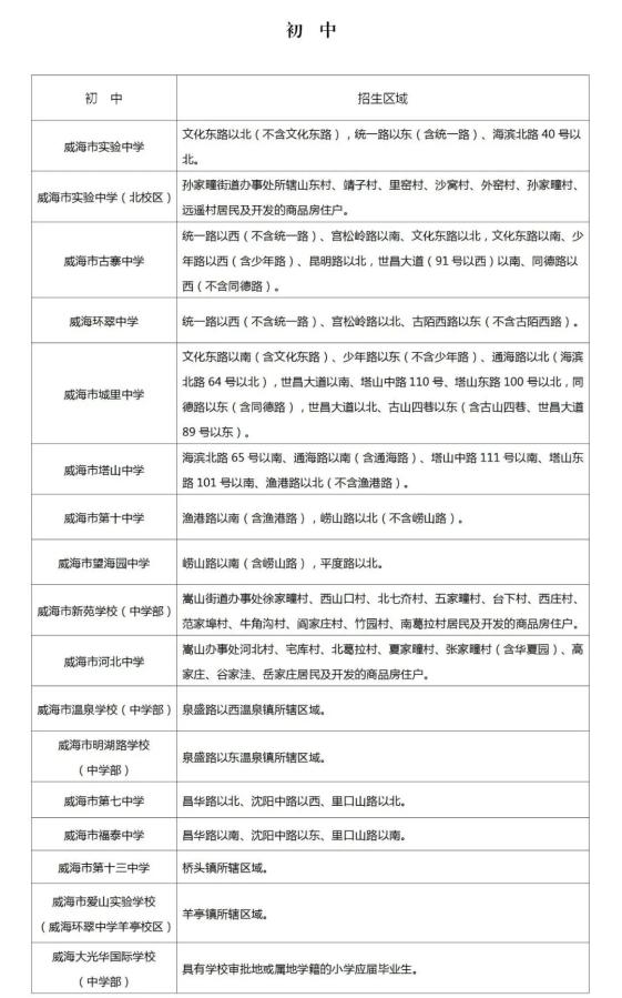 2. 初中招生对象:环翠区户籍及外来务工人员随迁子女的小学应届毕业生。