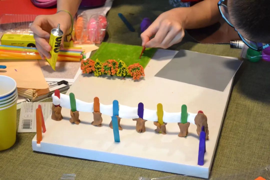 每个小组根据调研发现的问题和提出的解决方案,从“为谁设计”、“有什么功能”、“需要解决什么问题”出发,确定规划目标和规划焦点,对“美好街道生活”进行畅想并设计方案,用超轻粘土、瓦楞纸、彩色吸管等材料制作出方案模型,并填写“小小社区规划师”作品设计说明。