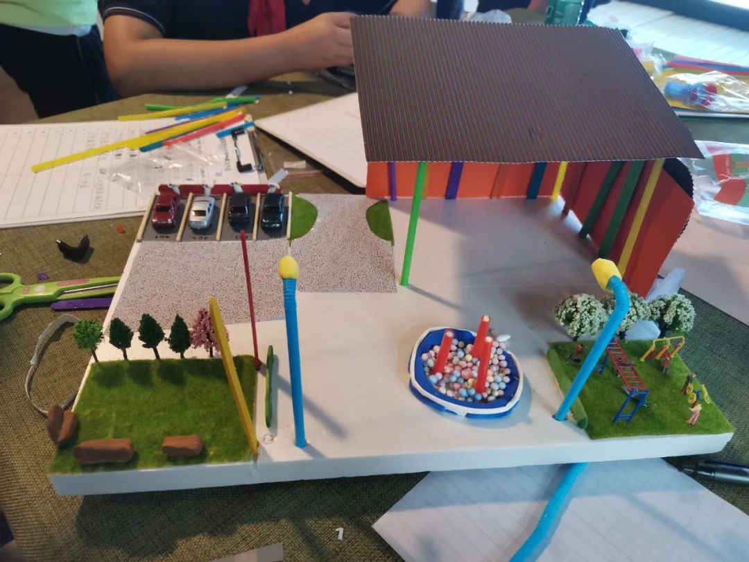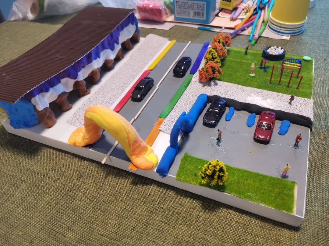三组的小小规划师们聚焦于解决停车场与游乐场地的矛盾和社区绿化少的问题。将社区停车场划出明确停车线,人车分流;专门设计有海绵球和健身设施的儿童游乐空间;把社区的更多的绿地做到了屋顶,变成社区里的屋顶绿化。