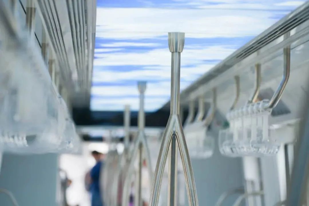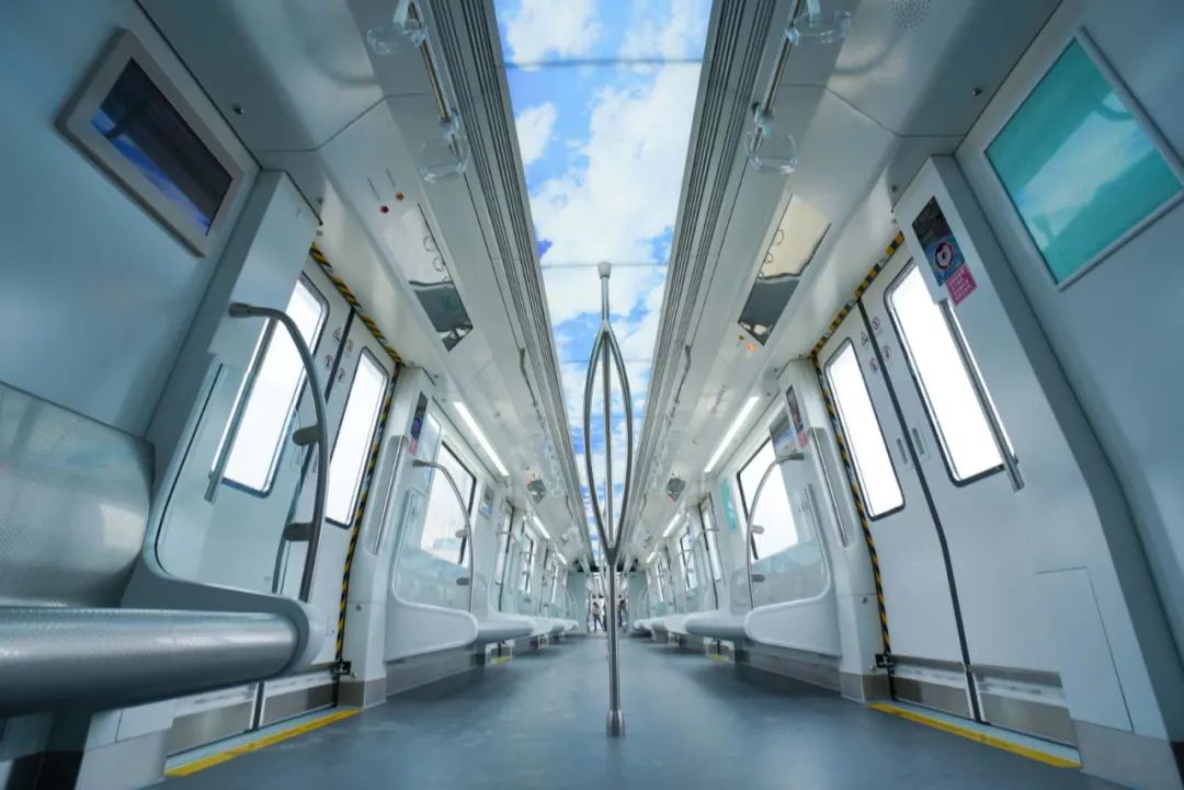 列车的内饰色彩基调与外观相互呼应,以白色为主,配以“蓝天白云”车顶,造型新颖、美观大方,色调协调、明快、柔和,具有现代气息。