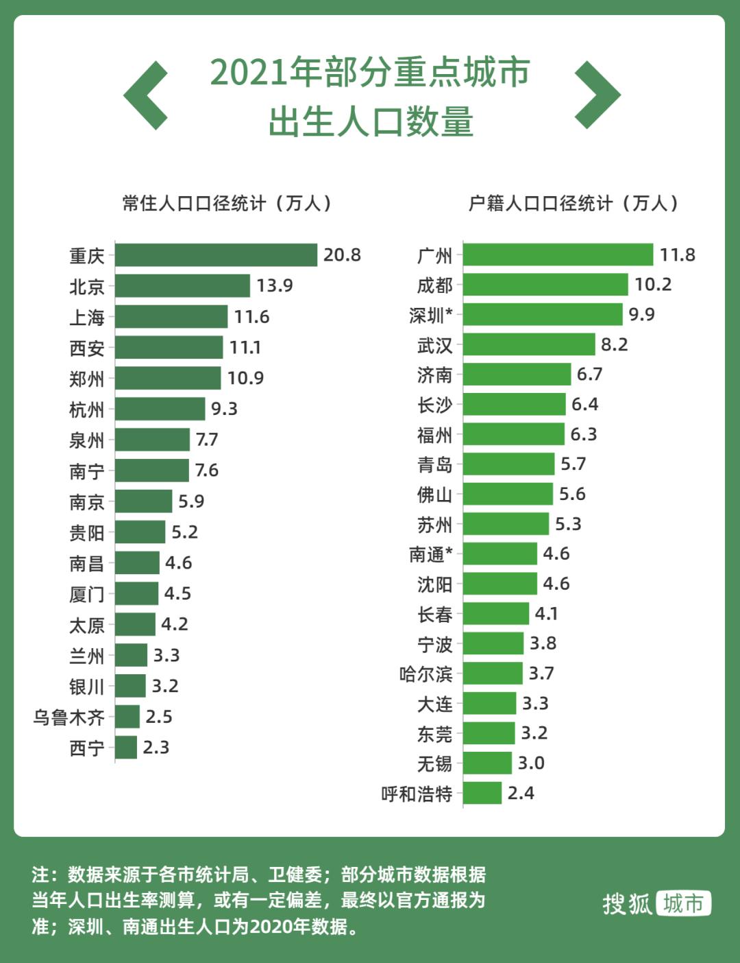 2021年,10座重点城市扛起了全国生育大旗。其中有7座城市出生人口超过10万,分别是重庆、北京、广州、上海、西安、郑州和成都;还有3座城市超过8万,分别是深圳、杭州和武汉。深圳出生人口数据虽为2020年,但从卫健委公布的数据来看,深圳2021年常住产妇15.5万人,比2020年(16.5万人)只少了6%,2021年出生人口大概率不会低于8万。