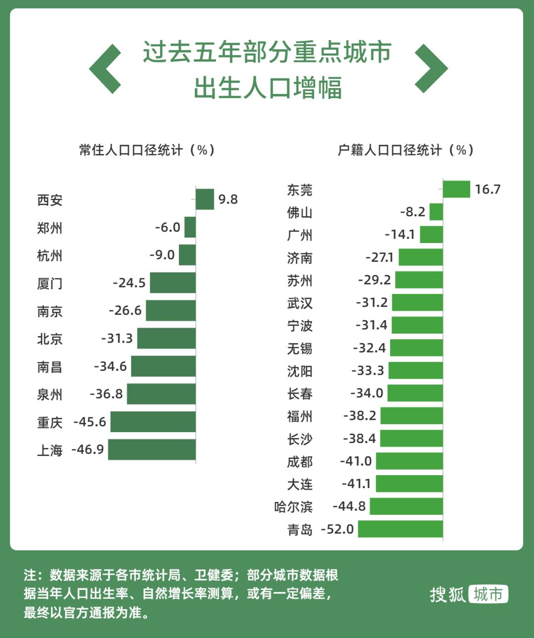 另外需要解释的一点是,由于各大城市统计口径不同,我们将常住人口口径与户籍人口口径统计的城市分开排列,以便更为科学地观察城市生育图景。