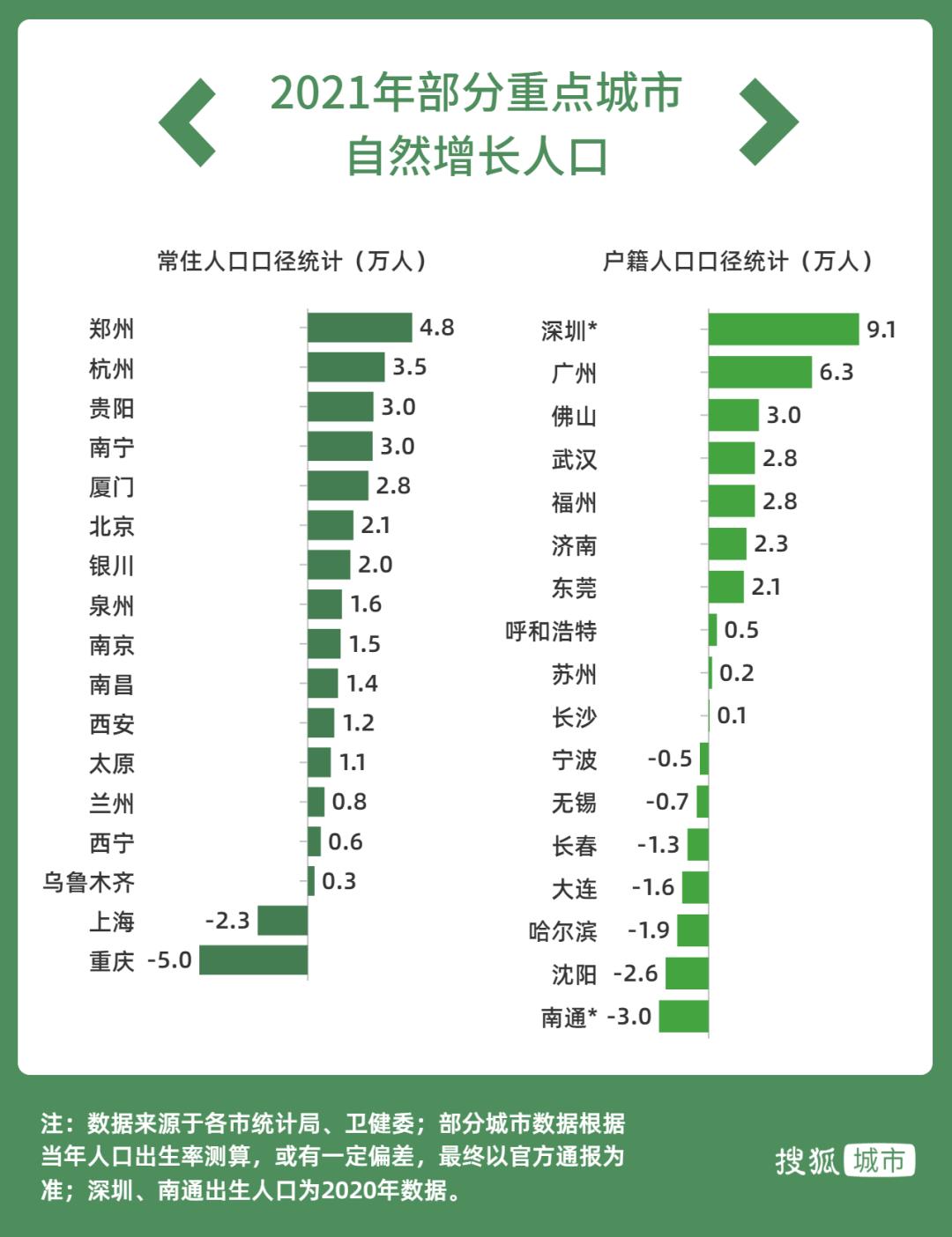 重点城市的人口增长形势同样不容乐观。2021年,重庆、上海、沈阳、大连、长春、哈尔滨、无锡、宁波、南通等9个重点城市进入人口自然负增长时代,仅有广州、深圳等少数城市扛起人口增长大旗。
