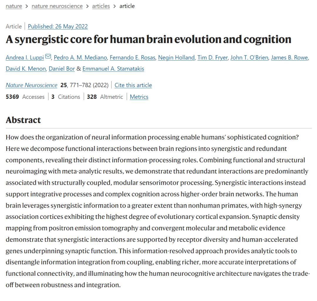 总的来说,上述这些发现表明,人脑演化可能导致了信息协同交互的主导。