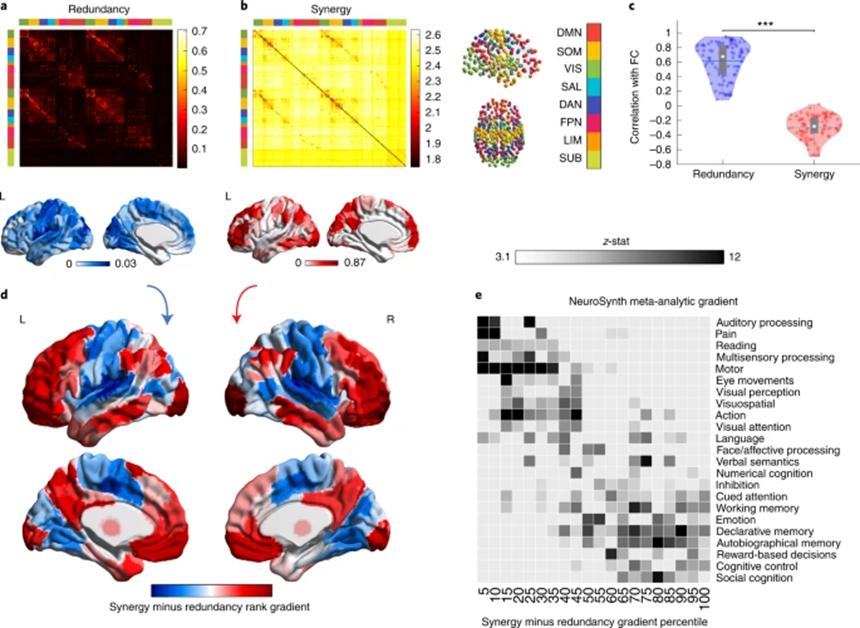 冗余到协同的梯度模式与功能网络划分与细胞构筑层级分布的一致性,也提示了二者的交互可能在不同的认知领域存在差异。因此研究中利用NeuroSynth进行了基于术语的元分析,比较了24个认知术语(包括从低级感觉运动到高级的认知功能)的任务激活元分析结果与冗余-协同梯度空间模式的相似性。结果表明,高冗余的区域主要参与到听觉、视觉、多通道感觉加工和运动中;高协同的脑区则参与到社会认知、记忆和认知控制中,这些高级认知功能需要更复杂的信息整合(图1e)。