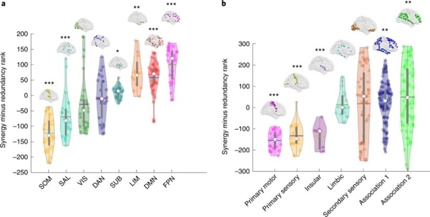 研究者进一步计算每个脑区与其他脑区间的相互协同高于相互冗余的程度(协同-冗余),来提供一个相对于冗余的协同程度参考,然后根据其进行了排序,得到了在更倾向冗余到更加倾向协同这一维度上存在梯度变化的脑区分布图(图1d)。根据Yeo的子网络划分,感觉运动区、凸显网络和大部分视觉区存在很高程度的冗余加工;对应于冯·艾克诺默(Von Economo)的细胞构筑分类,这些冗余信息加工区域主要集中在初级感觉、初级运动和岛叶皮层(如图2所示)。相反,在高级皮层脑区的协同程度要高于冗余,包括默认网络(DMN)、额顶执行控制网络(FPN)和边缘网络(眶额皮层和颞极等)。