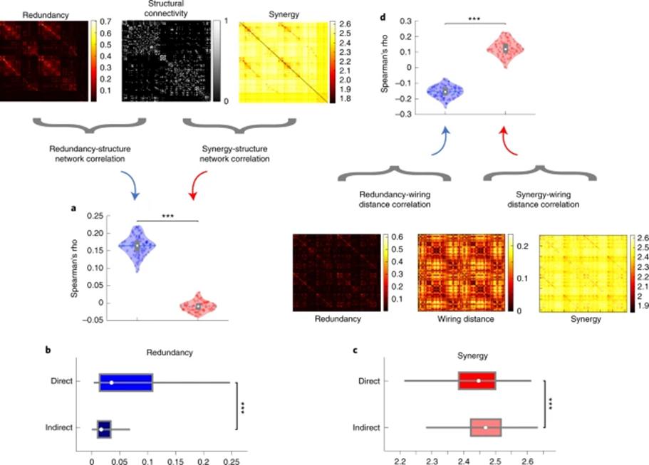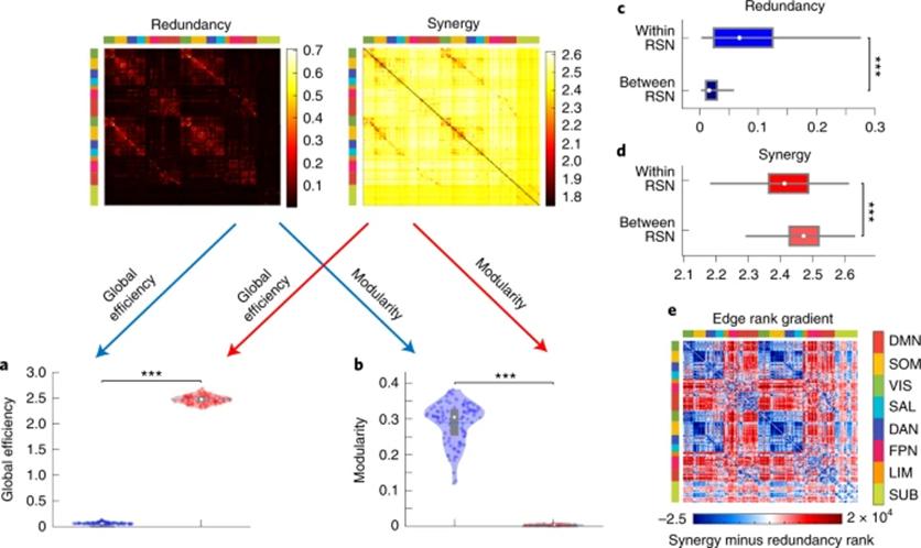 一种理论观点认为,认知架构被强制设计为能够同时满足两种不同且相反的需求:初级感觉运动需要将整个网络分为一些互相分离的模块,而高级认知功能的信息整合则需要一个高度连通的网络组织。本研究通过直接比较图论指标与冗余/协同的关系,来试图解答人脑如何解决上述特异性加工与全局整合间的矛盾。通过计算被试间的相关,研究者发现功能网络的全局效率与脑区间的协同的相似性要显著高于与冗余的相似性;相反地,网络的模块化指数则与脑区间的冗余信息的相似性显著高于与协同的相似性(图3)。因此这两种不同的信息交互可以用于反应两种存在明显区别的图论属性。进一步分析发现,冗余信息更多地存在于静息态功能子网络的内部而非网络间,同样地对于协同信息来说模式正好完全。说明在分离的子网络内的脑区间交互更依赖于冗余信息,而与此同时,协同信息则支持了不同子网络间的整合加工。