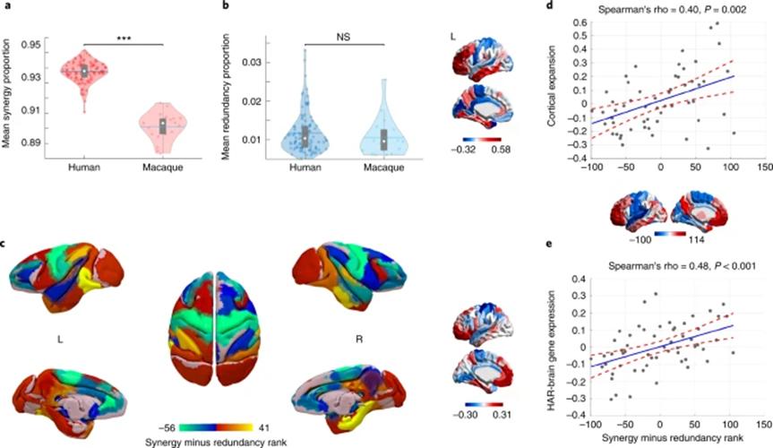 为了实现独特的复杂认知能力,人脑需要信息高度的协同性。研究者认为协同信息加工为高级认知功能提供了可能性,因此汇集了3种方法来对这一假设进行验证。首先,研究者比较了人脑和非人灵长类(猕猴)的不同类型信息各自在总信息流中所占的比例。在冗余信息上,两者没有显著差异;但在协同信息加工上,人类的协同信息要显著的高于猕猴。将冗余-协同梯度变化呈现在猴脑上时(如图5c),可以观察到其整体模式与人类相似,体现出在演化中的相对稳定性。但在猕猴的前额叶皮层(PFC)中冗余信息的加工占主导地位,而该区域是在人脑中协同信息加工最强的区域。有趣的是,PFC也是在人类演化中存在实质性皮层扩张的区域。这一发现提示了,在人脑中较高的协同信息加工的区域分布可能与演化过程中的皮层扩张存在关联。因此研究者接着计算了冗余-协同梯度变化与人类相较于黑猩猩的皮层扩张脑图间的空间分布相似性。结果得到了显著的正相关,意味着演化中出现的额外皮层组织可能有助于协同信息加工的出现。最后,研究者利用艾伦脑科学研究院(Allen Institute for Brain Science)提供的脑遗传图谱,计算发现冗余-协同梯度模式与区域上特定的基因表达模式显著相关,包括与脑发育、脑功能(智力和突触传导)有关的基因,以及基因中与人脑相关的人类快速演化区域(HAR-Brain genes)。换言之,在人类中具有特殊功能的基因更倾向于表达在协同脑区。