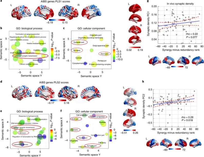 人脑中如此高的协同加工是如何获得的?为了从神经生物学角度回答这一问题,研究者进一步对冗余-协同梯度与AIBS中提供的20674个基因的区域表达模式间的相似性进行了关联分析。利用偏最小二乘(partial least-squares,PLS)回归,得到了两个可以解释30%梯度变异的PLS成分(显著高于随机预期)。两个成分都显著地富集于基因的人类快速演化区域(HAR-Brain),与上面假设驱动得到的结果一致。通过基因本体(Gene Ontology,GO)分析得到成分的转录特征显著地富集于与学习记忆、突触、突触传导等相关的基因(图6a-e)。
