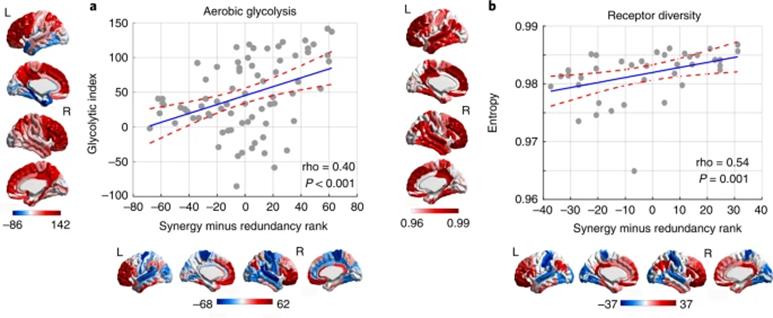 此外,尽管突触的密度可以反映整合多种信息的潜力,但神经元之间的实际交流需要多种不同的神经递质作用在多样的受体上。神经递质的分布在人类大脑的不同区域和相同区域的不同层(外颗粒层、颗粒层和内颗粒层)也存在很大的不一致,相应区域的功能也存在系统上的差异。研究者推断多样化的受体表达可以赋予一个区域更强的灵活性,因而受体的活动可以反映不同输入信息的整合和受到不同区域神经调节物质的影响。对于这一分子多样性和协同信息加工之间存在关联的假设,结果表明冗余-协同梯度与15种不同受体类型以及3种不同层间的受体密度的多样性增加存在显著正相关。这说明更多样化的突触受体类型意味着该区域能够响应和整合更大范围的信息,并体现在该区域的协同优势更高。