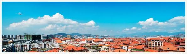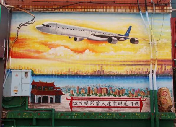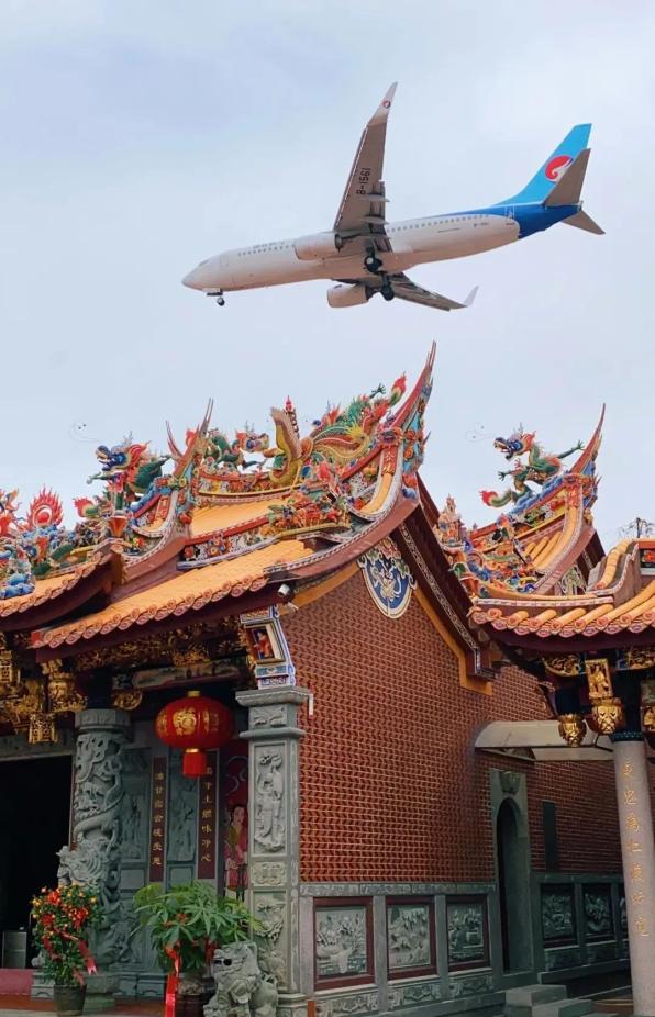 飞机掠过古厝、庙宇、戏台、街道的一幕