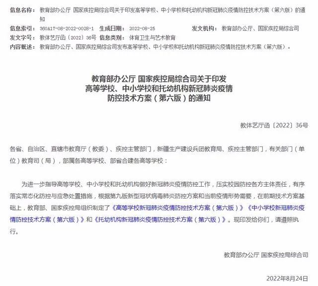 原标题:《最新!教育部发布高等学校、中小学校和托幼机构新冠肺炎疫情防控技术方案(第六版)》