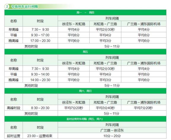 1. 2号线每周五、周六延长运营时间,不含2号线东延伸段(广兰路站-浦东国际机场站)。