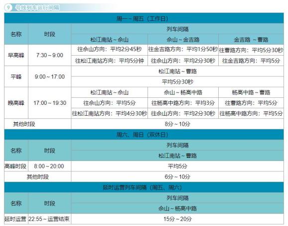 1. 9号线佘山站至杨高中路站区段每周五、周六延长运营时间。