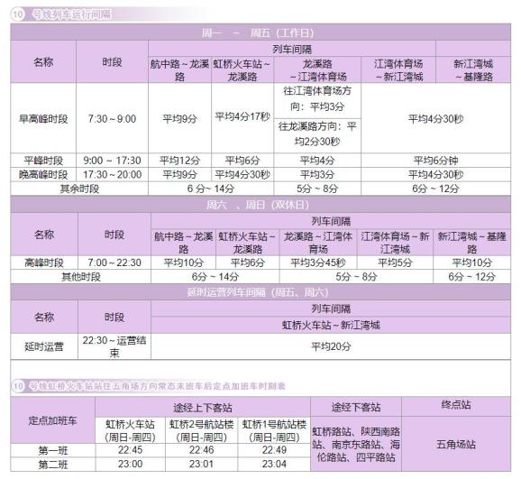 1. 10号线虹桥火车站站至新江湾城站区段每周五、周六延长运营时间。