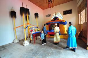 成吉思汗灵榇安置在大佛殿西配殿,还有成吉思汗巨幅画像、成吉思汗的作战旗徽苏律定等。