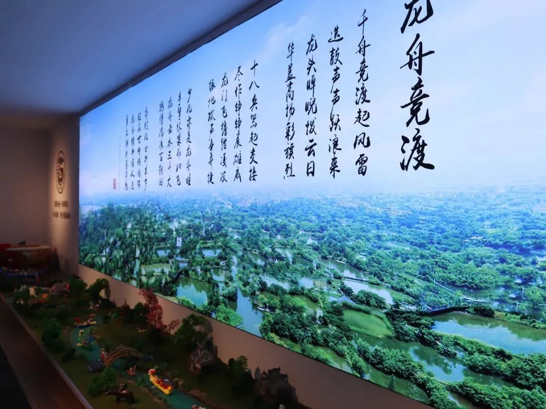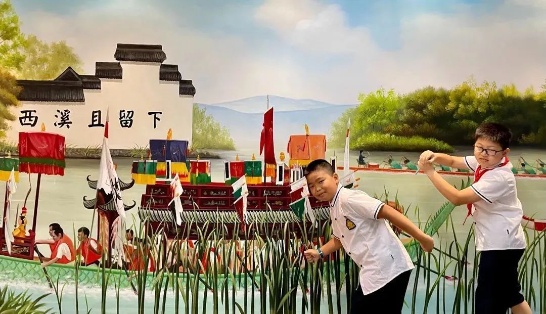 去年6月11日,在西湖区教育局、蒋村街道、蒋村龙舟协会等大力支持下,少儿龙舟文化研究院正式开馆。研究院分“蒋村龙舟实物区”“龙舟工艺操作区”“龙舟竞渡墙绘区”等7个小场馆,占地约900多平方米,不仅凝聚了龙舟胜会这一历史明珠的广博内涵,更凝结了文溪小学全体师生的热情与智慧。“龙舟击水三千丈,撼得沧浪百转回。”在文溪小学沈明伟老师创作的《龙舟竞渡》诗歌下方,一个长长的沙盘模型将西溪风貌徐徐展开。湖面上的龙舟便是由泥塑社团的师生共同制作,更有书法社团题写的龙字墙、凹凸印社制作的龙舟版画……大到场馆布局,小到龙舟船桨上的花纹,都由文溪小学师生自主设计完成。