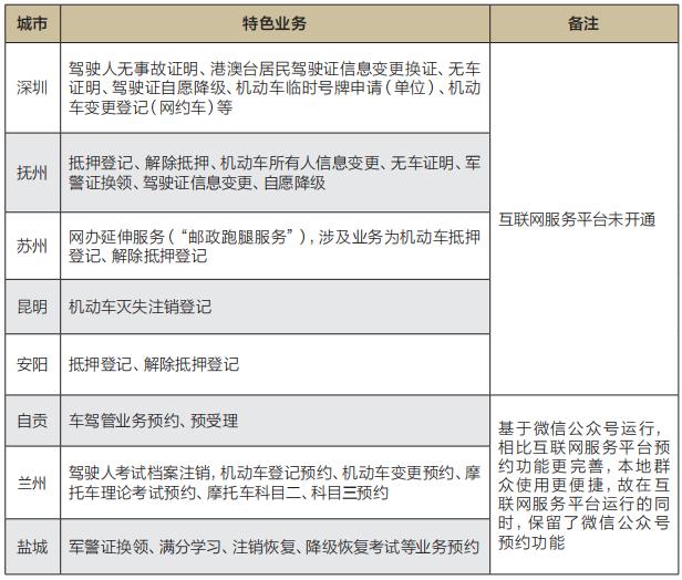 随着“放管服”改革的持续推进,各地公安交管部门不断拓展互联网服务事项,最大限度满足群众网上办理交管业务的新需求。目前各地主要以互联网交通安全服务管理平台(以下简称“互联网服务平台”)为载体开展网上车驾管业务办理。此外,部分地区针对本地区的业务办理个性化需求,还开发本地平台,与全国互联网服务平台形成优势互补,如深圳的“星级用户平台”、抚州的“车管警邮通”等,各地本地平台办理的特色业务见表1。