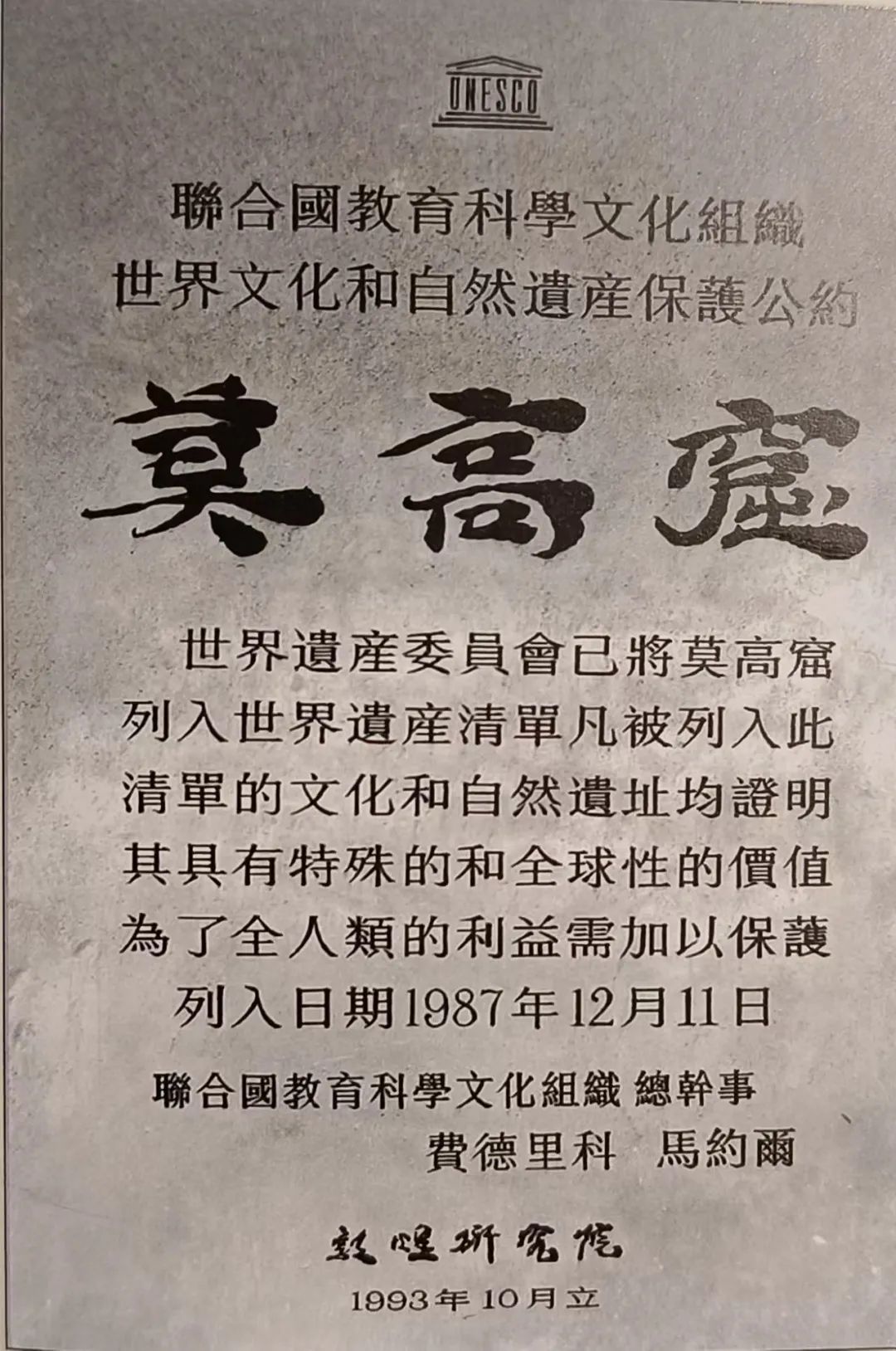 1987年12月11日,联合国教科文组织正式批准莫高窟列入《世界遗产名录》。时任联合国教科文组织总干事费德里科•马约尔签署的世界遗产证书中这样写道:“世界遗产委员会已将莫高窟列入世界遗产清单,凡被列入此清单的文化和自然遗址,均证明其具有特殊的和全球性的价值,为了全人类的利益需加以保护。”自此,这颗文化遗产明珠、沙漠里的艺术宝库有了新的身份;它的价值得到全世界的认可,成为全人类共同的精神财富。