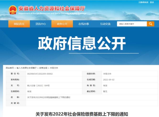 9月2日,安徽省人力资源和社会保障厅网站发布通知,公布安徽省2022年社会保险缴费基数上下限。