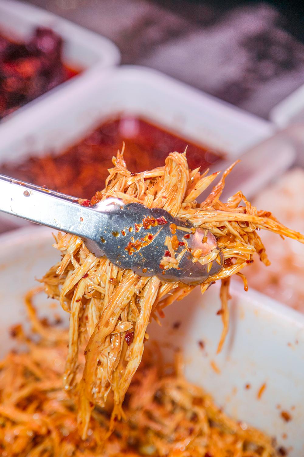 他们家值得推荐的就是每天现拌现卖的豆笋,豆笋切的很细,香浓的辣油已经浸透豆笋,咸香入味。