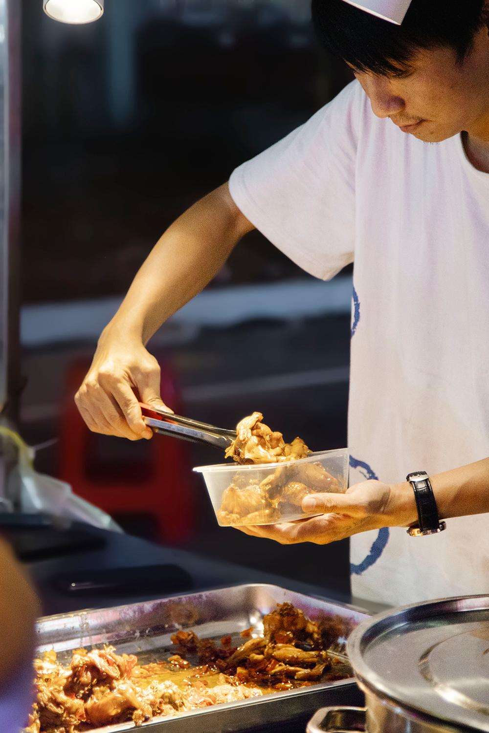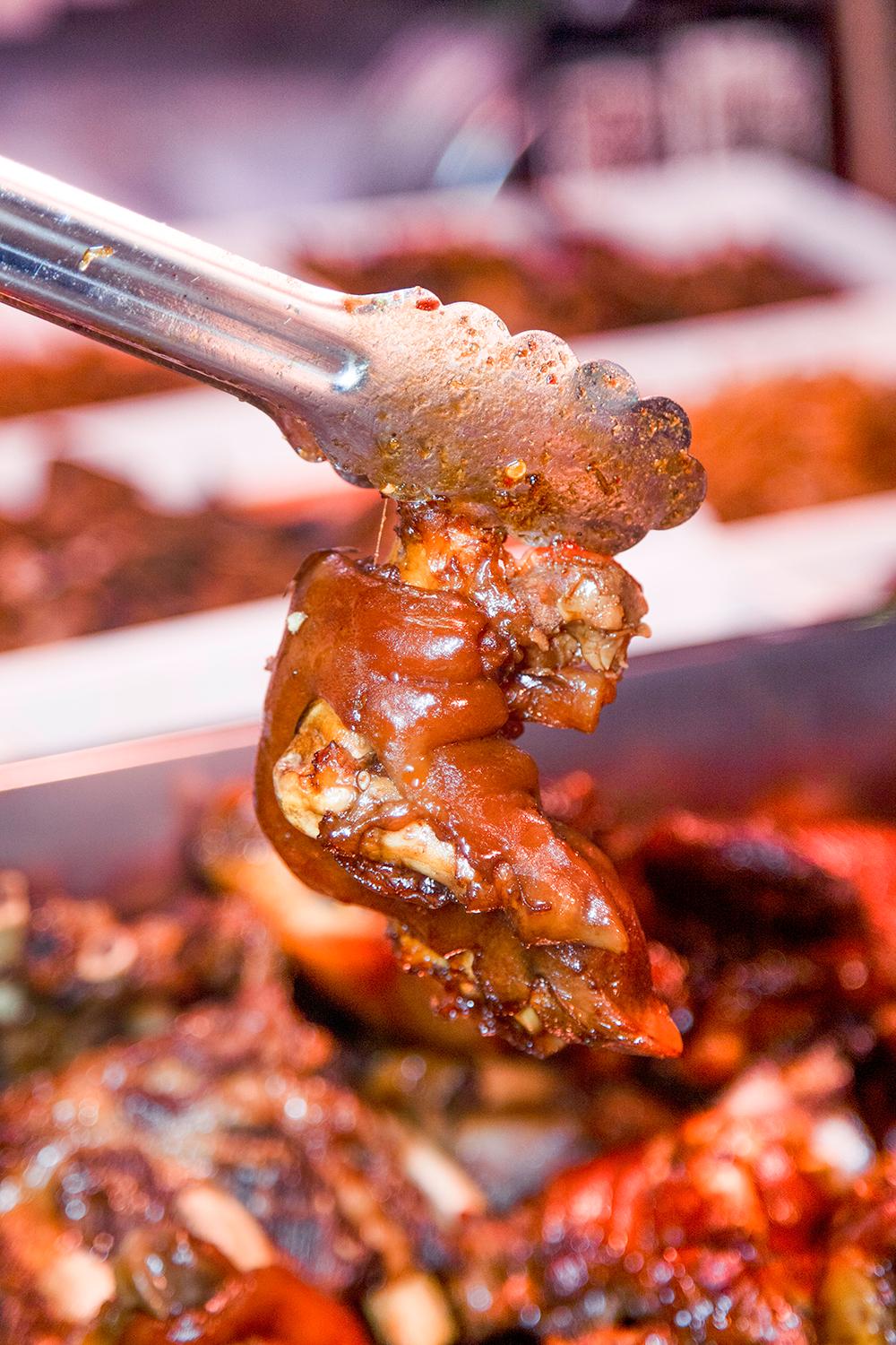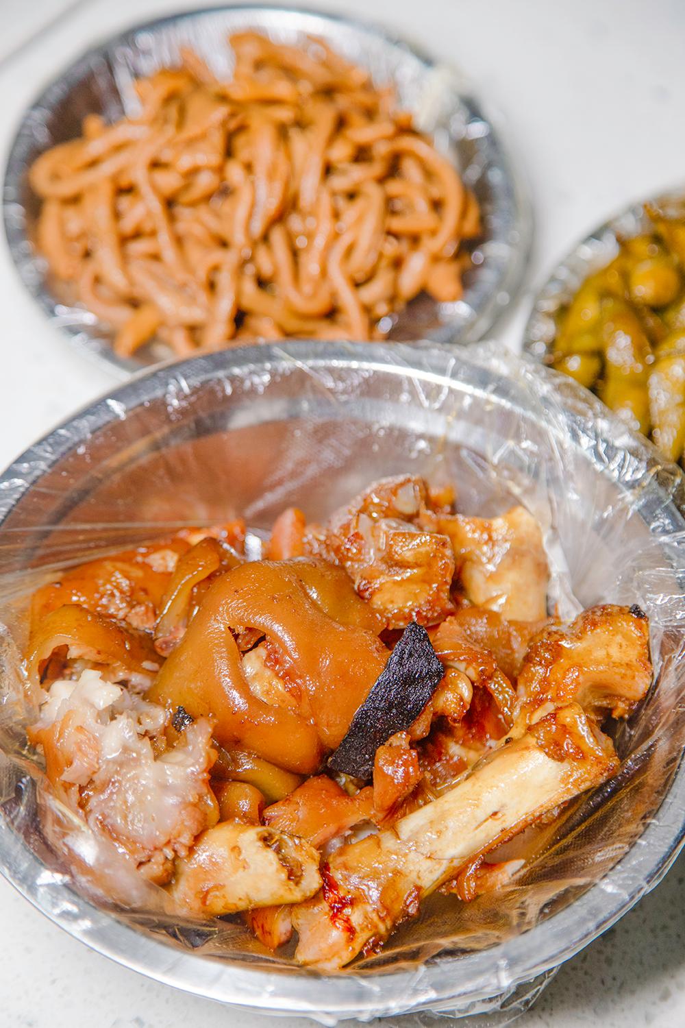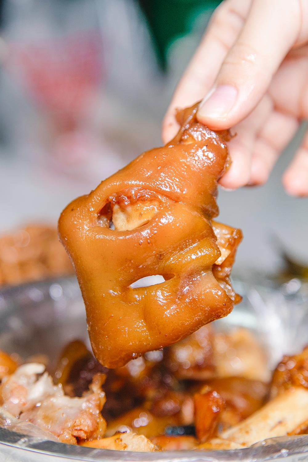 色泽油亮的猪脚是他们家的当家花旦,每一只猪脚都经过两小时以上的卤制,筋弹皮嫩、微辣鲜香,让人想狂啃一大口。
