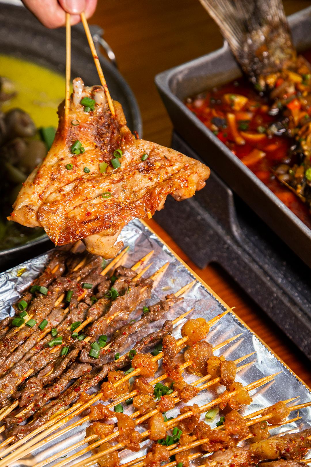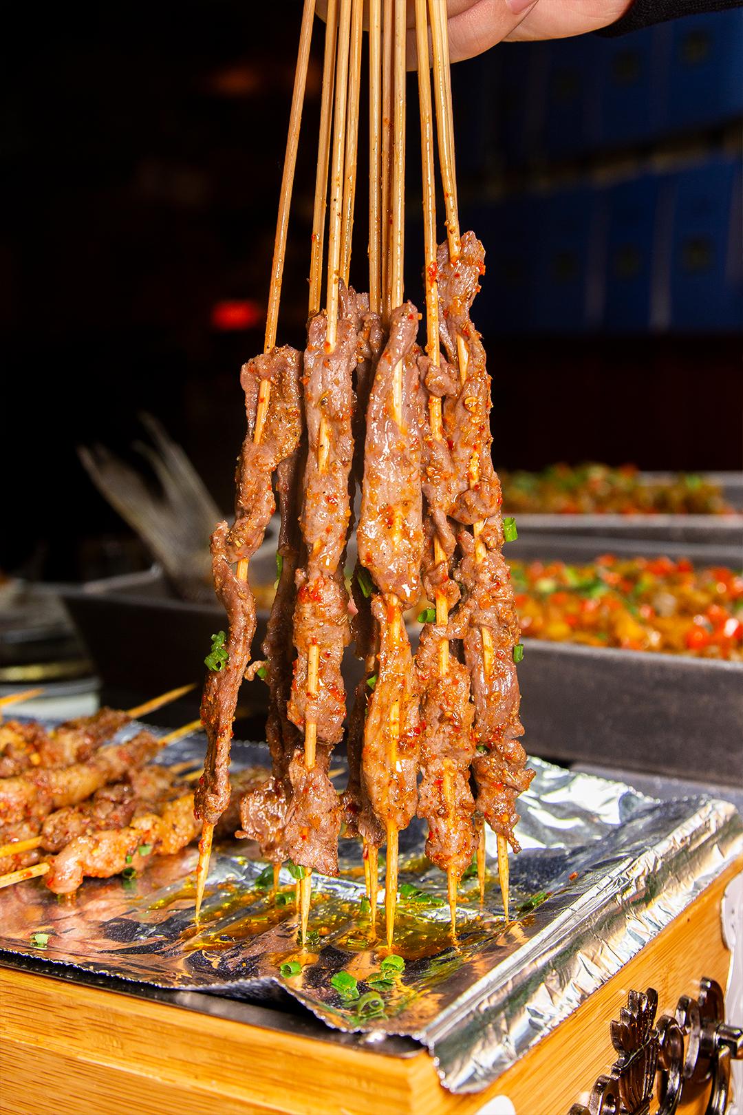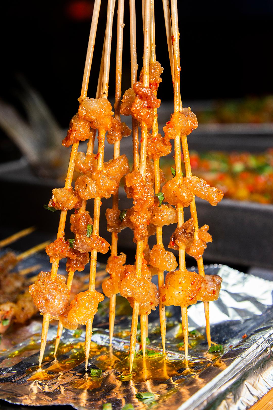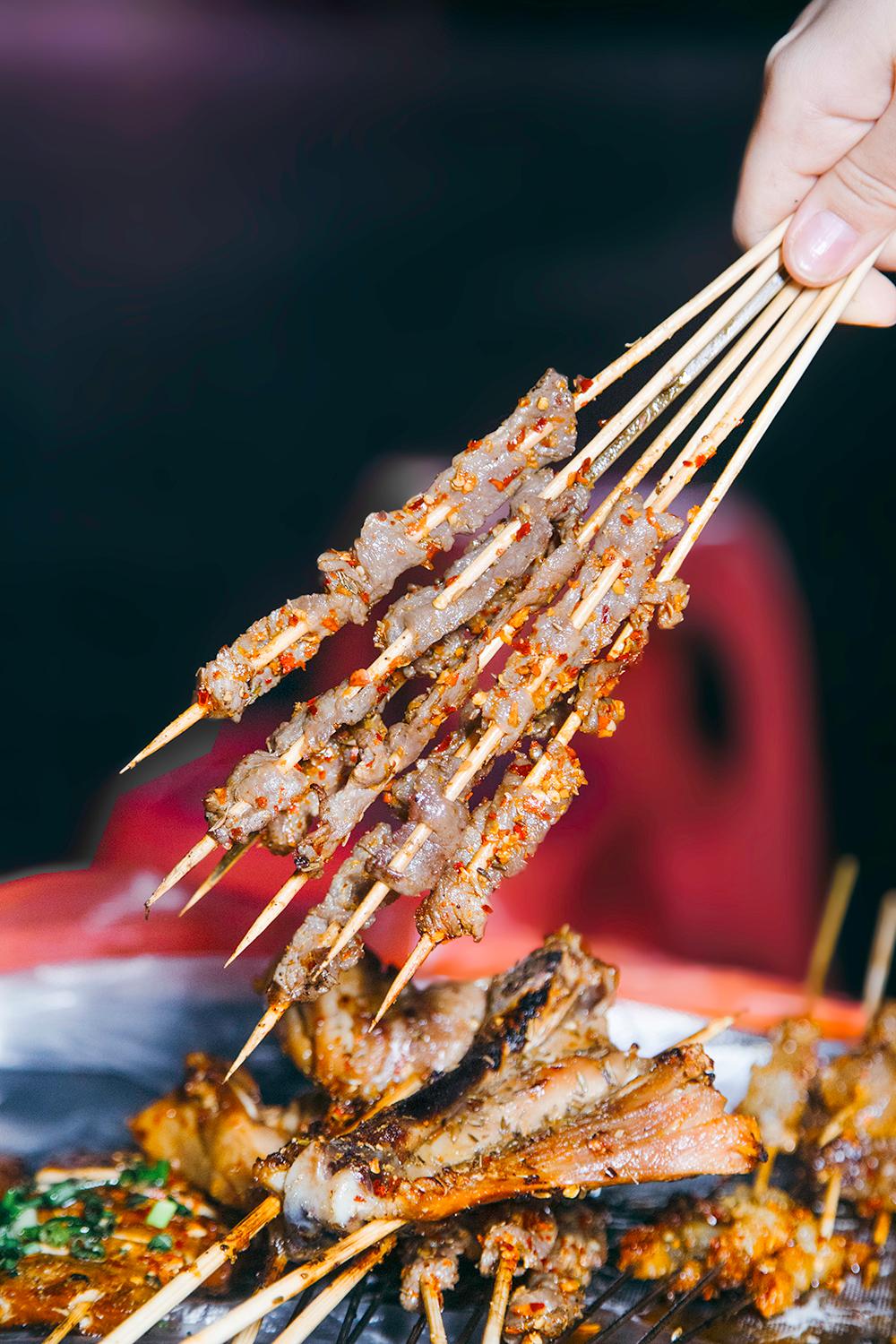 来殷胡子烧烤一定少不了牛肉串、牛油、牛蹄筋和豆干,刚刚烤好的食材还带有炭火独有的烟熏气,忍不住想要狂炫一番。