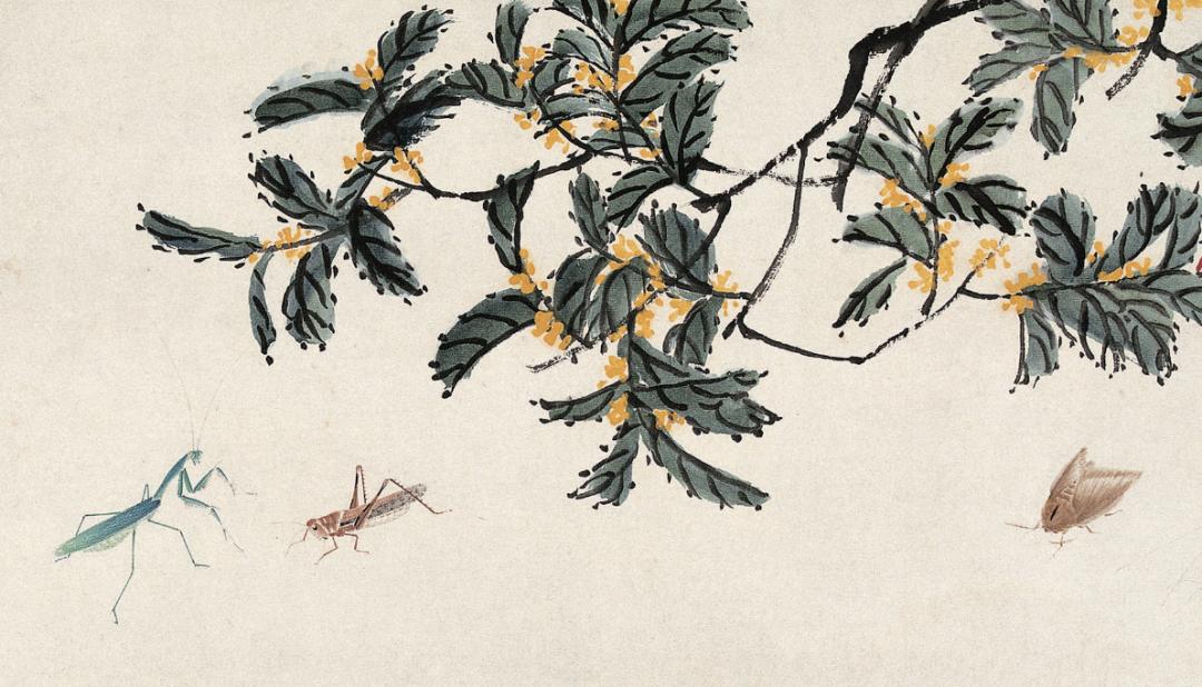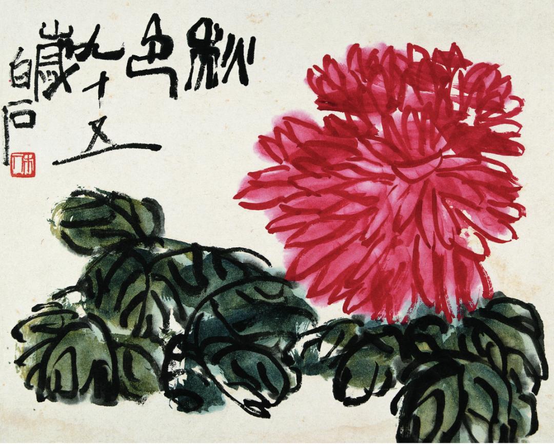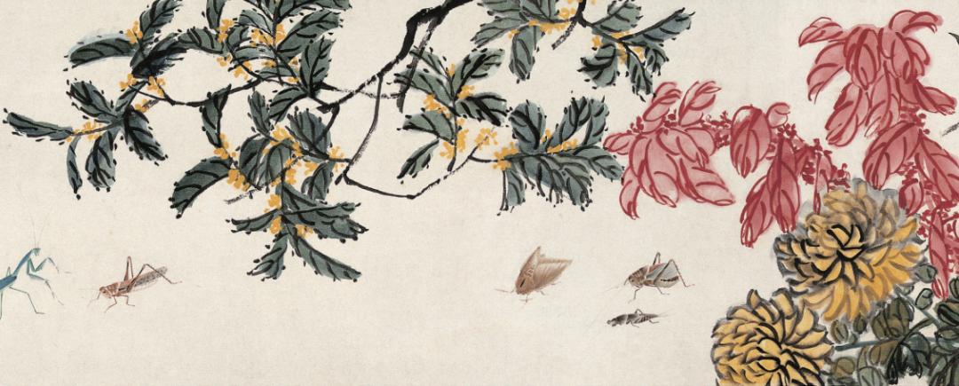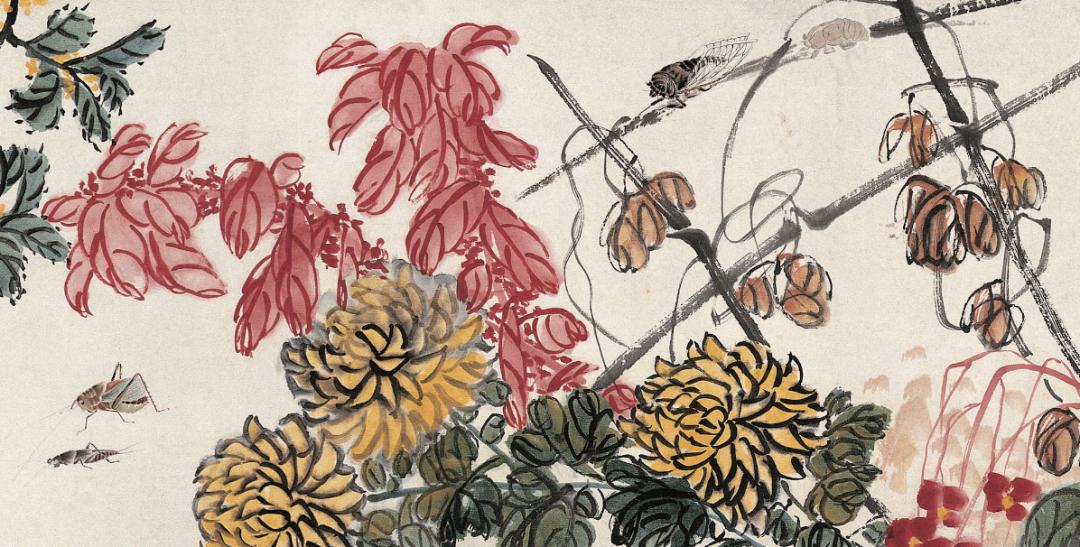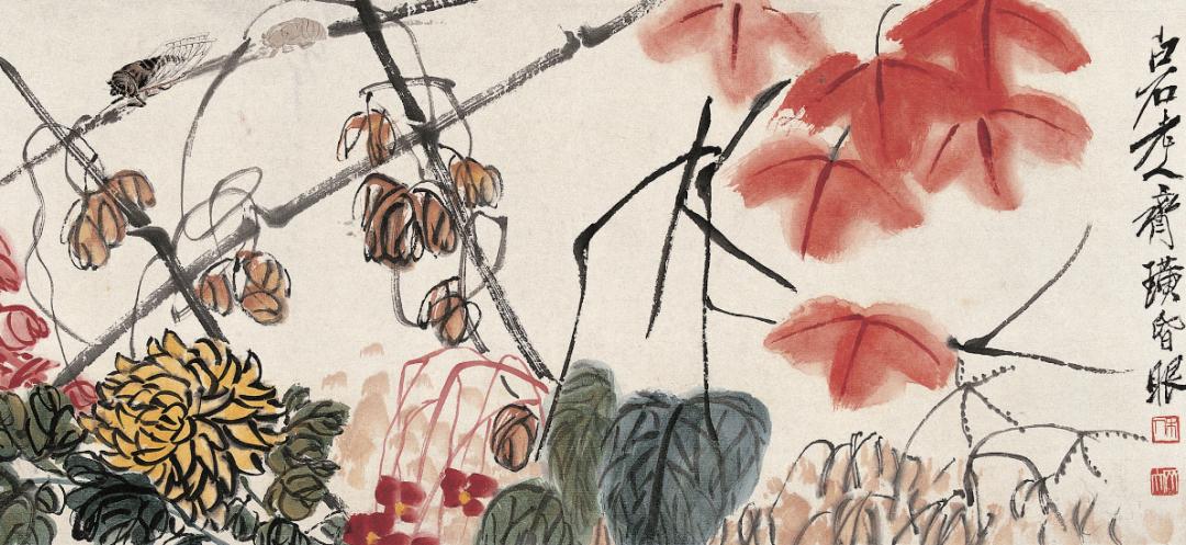 对于白石老人来说,秋是满山的枫叶、湘潭遍开的金桂,是叶比花娇的雁来红、星塘里映着天光的牛筋草;是寄萍堂下垂红可爱的秋海棠、沾着露水风姿摇曳的秋菊秋草,也是菜畦里飞舞跳动的秋虫及树枝上的知了。对晚年定居北京的白石老人来说,一张张明丽的九秋图,画的都是白石老人久客京华的思乡之情,是画家对故乡的眷恋和最美好的回忆。