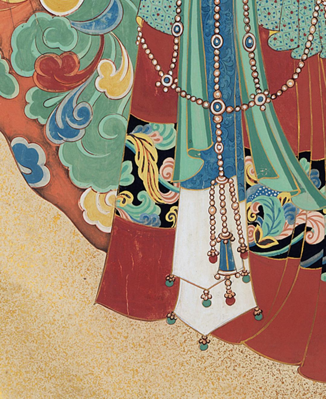 除人物面容、精神、性情以外,画家对服饰的花纹与色彩、画面装潢的形式也多有着墨。敦煌稽古将张大千对华美、精致的理解推进到了唐人的层次,正因如此,《红拂女》有著初唐秀骨丰肌、优雅自信的女性形象;并且身上的服装款式、花纹色彩,也无一处不根据唐代画作,绝不凭空捏造,也不任意省略。《红拂女》从最初的构思到最后的上色,每个阶段都是千锤百炼的过程,大千以《红拂女》来证明他对敦煌技艺的掌握。