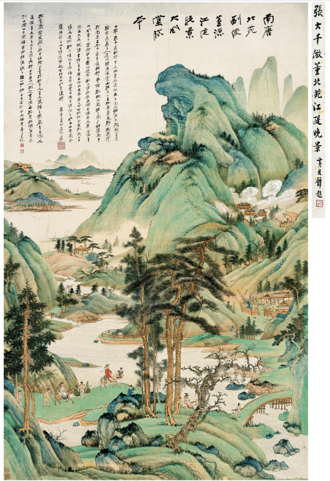 大千在购得董源的《江堤晚景》的同年春月,即在昆明湖上依原临摹一幅《江堤晚景》,即为本作。大千在画作中自题“南唐北苑副使董源江堤晚景大风堂临本”,并长题诉及与这幅董源的前后渊源。虽曰临本,然整幅青绿设色,鲜丽润泽,皴法、水法、树法、人物、鞍马皆从董源化出而又自出机杼,雍容壮阔,绿波粼粼,一片春风骀荡。