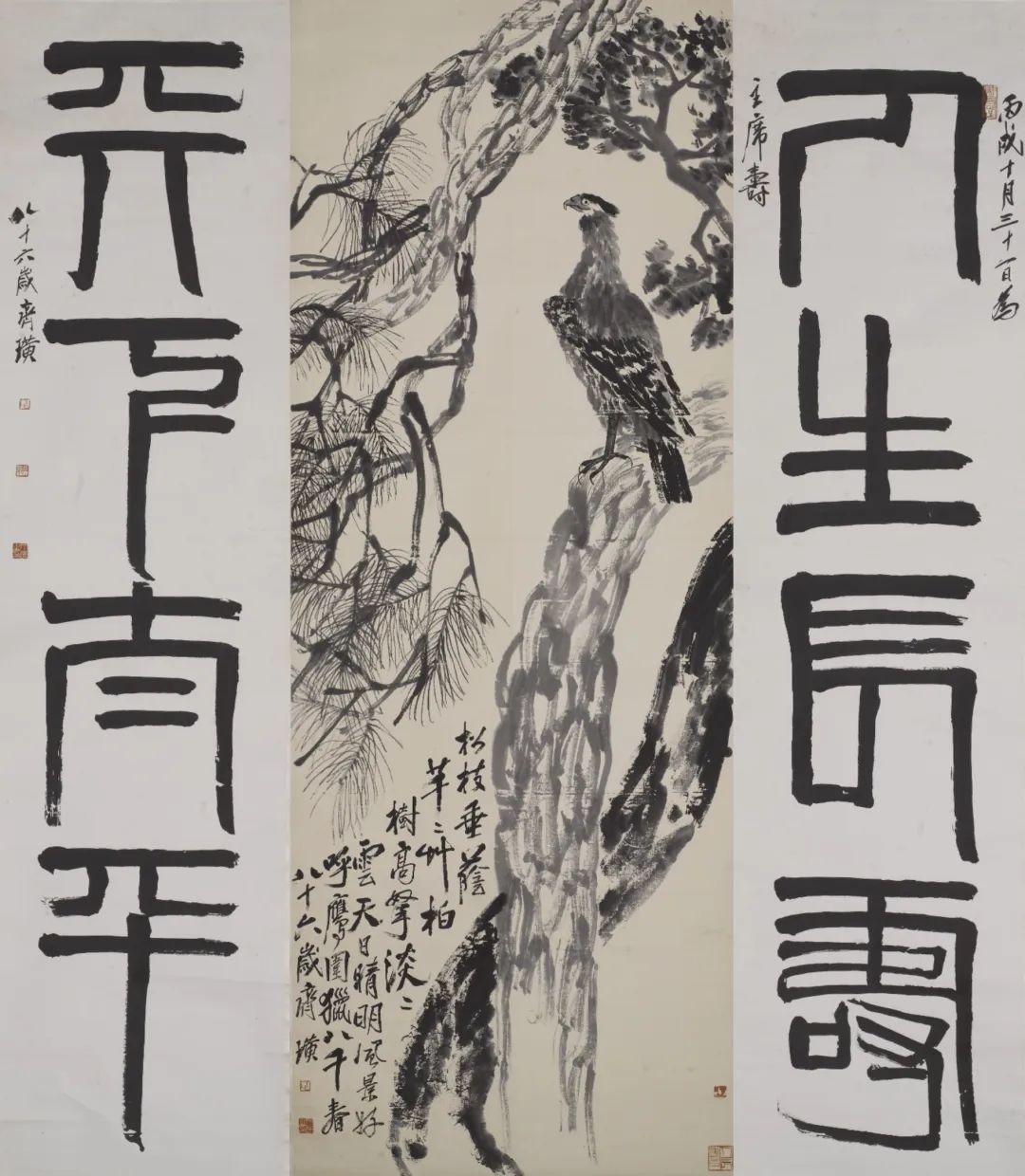 齐白石 《松柏高立图·篆书四言联》 纸本水墨 266×100cm,264.5×65.8cm×2 1946年 私人收藏 龙美术馆提供