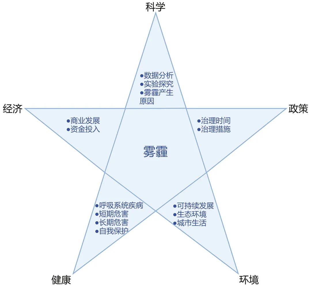 雾霾的形成原因是复杂的,对社会的影响也是错综复杂的。星形图可以把与雾霾相关联的领域联系起来,这也是要培养学生要从联系的视角看待社会的问题,而不单单是某一方面的探索与思考。